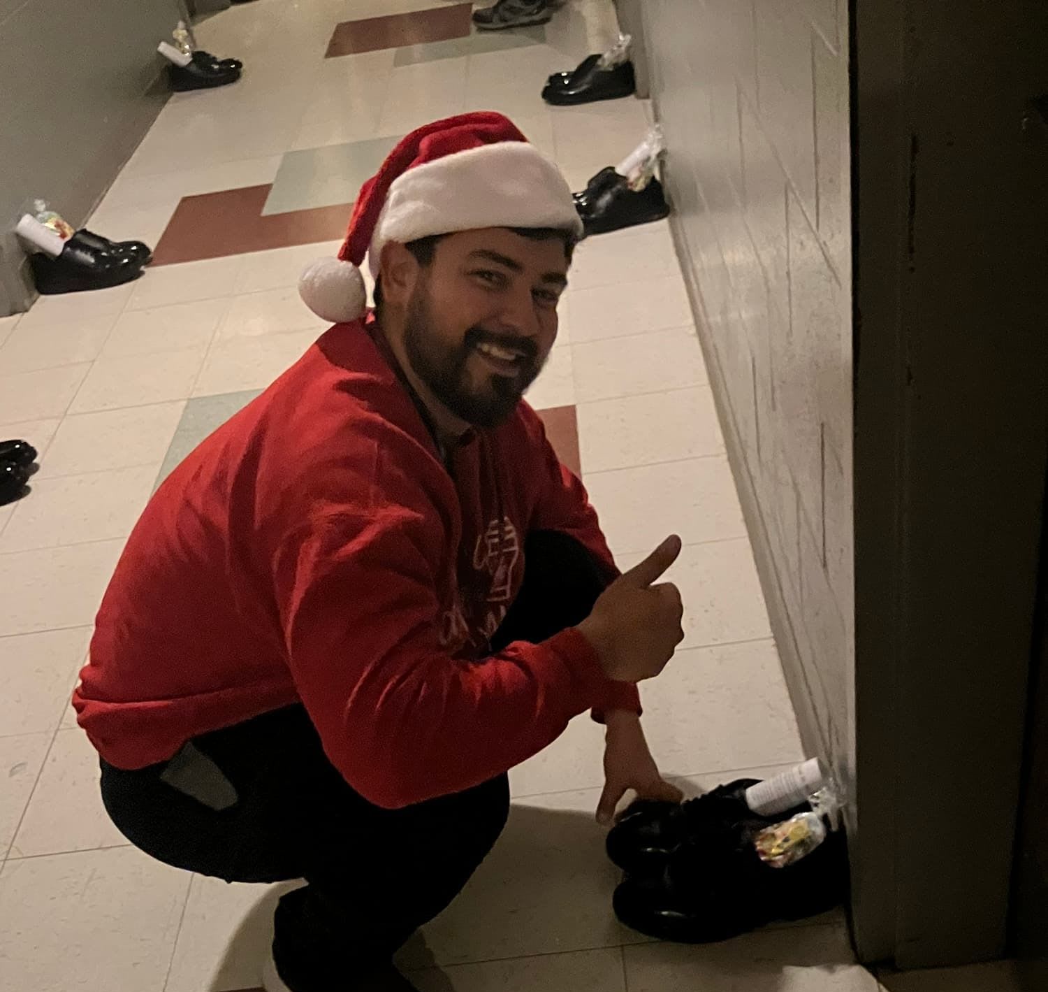 International Enrollment Counselor Rodrigo Padilla ’15 helps share some holiday joy with cadets on St. Nick Night.